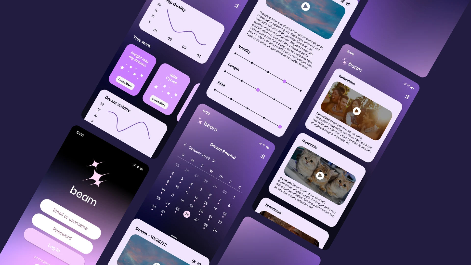 Beam is a conceptual mobile app that merges dream journaling with sleep tracking and data-driven insights. It empowers users to log dreams, analyze recurring themes, and uncover correlations between sleep quality and dream content.