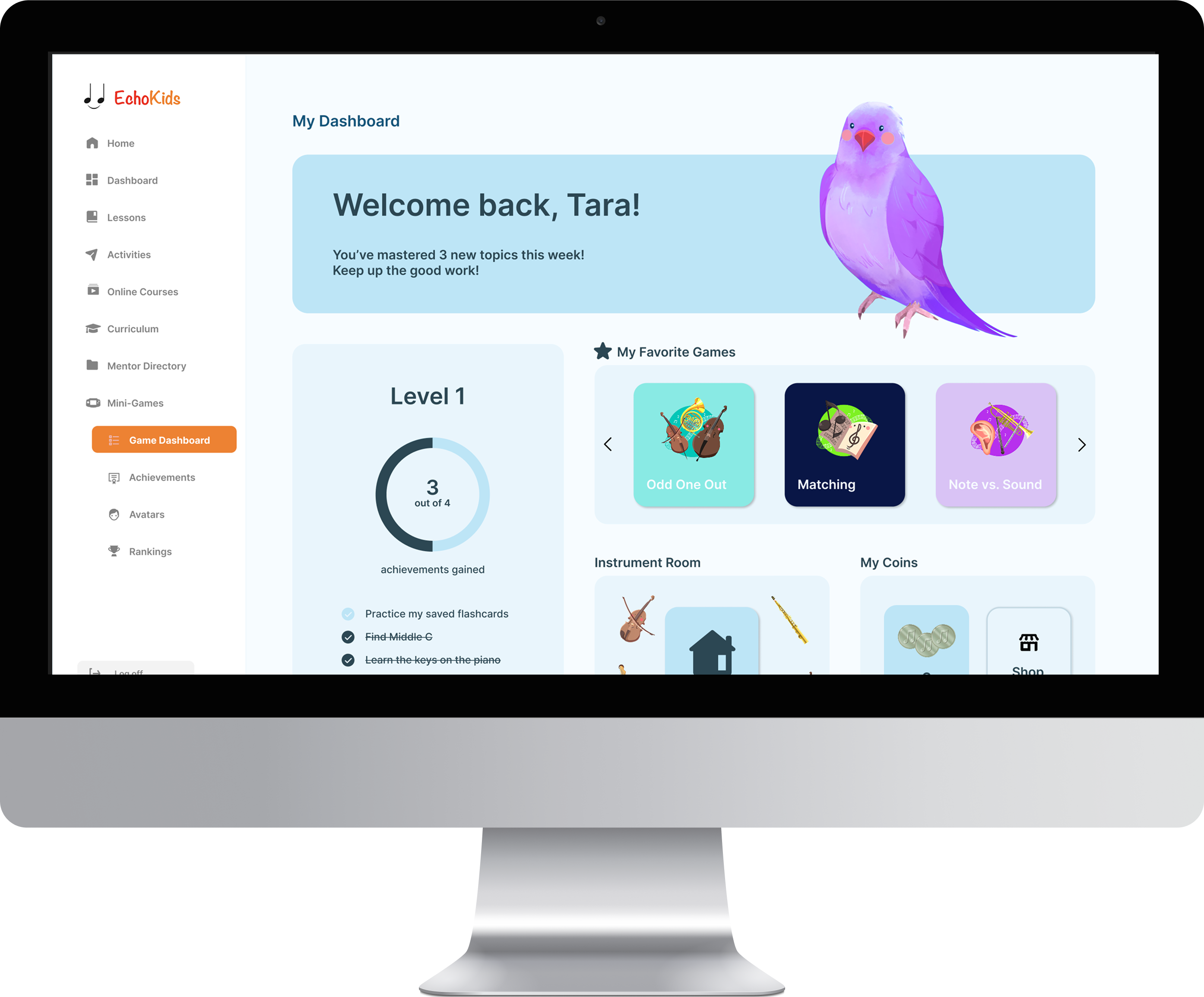 EchoKids is an online music education platform that connects children with engaging instrument and music theory lessons designed to prioritize learning, growth, and joyAs the platform grew, the team identified a need to better engage younger learners and help them track progress in a way that felt motivating and fun. This led to the creation of EchoKids Games, a gamified learning experience designed to complement lessons through play.