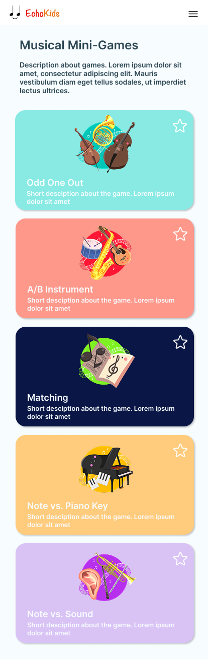 EchoKids Games is an interactive dashboard experience that allows children to learn musical concepts through mini-games, achievements, and visual progression. The product introduces gamification as a way to reinforce learning while making progress visible and rewarding.