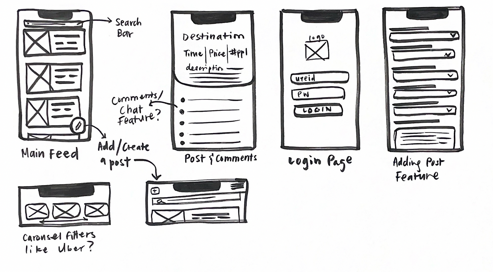 After identifying these priority features, we began to think of the flow of our app. This allowed us to narrow our MVP down to five screens, one for Login, Main Feed, Posting a Destination, and a Planned Route page with a chat feature. We sketched out some low-fidelity wireframes to help bring our idea to life: